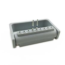 Porte-fraises universel pour fraises FG et RA ou fraises pour implants. Contient 24 pointes. Avec des caoutchoucs pour bloquer la pointe. Hauteur maximale des fraises 37 mm. Autoclavable à 121°. Couvercle transparent autoclavable