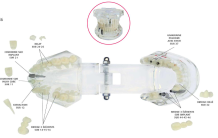 Mâchoire transparente à charnière, grandeur nature, pour montrer les racines. Le côté sain présente des dents et une occlusion normales. Le côté affecté présente de multiples pathologies, notamment : surrection, abcès alvéolaire apical avec caries, parodontite, abcès latéral, abfraction, courbure irrégulière de la racine, canine incluse, érosion, dent fracturée, impaction horizontale, pulpite radiculaire, canal radiculaire avec couronne, résorption interne, attrition, résorption radiculaire externe, implants et racine fracturée.